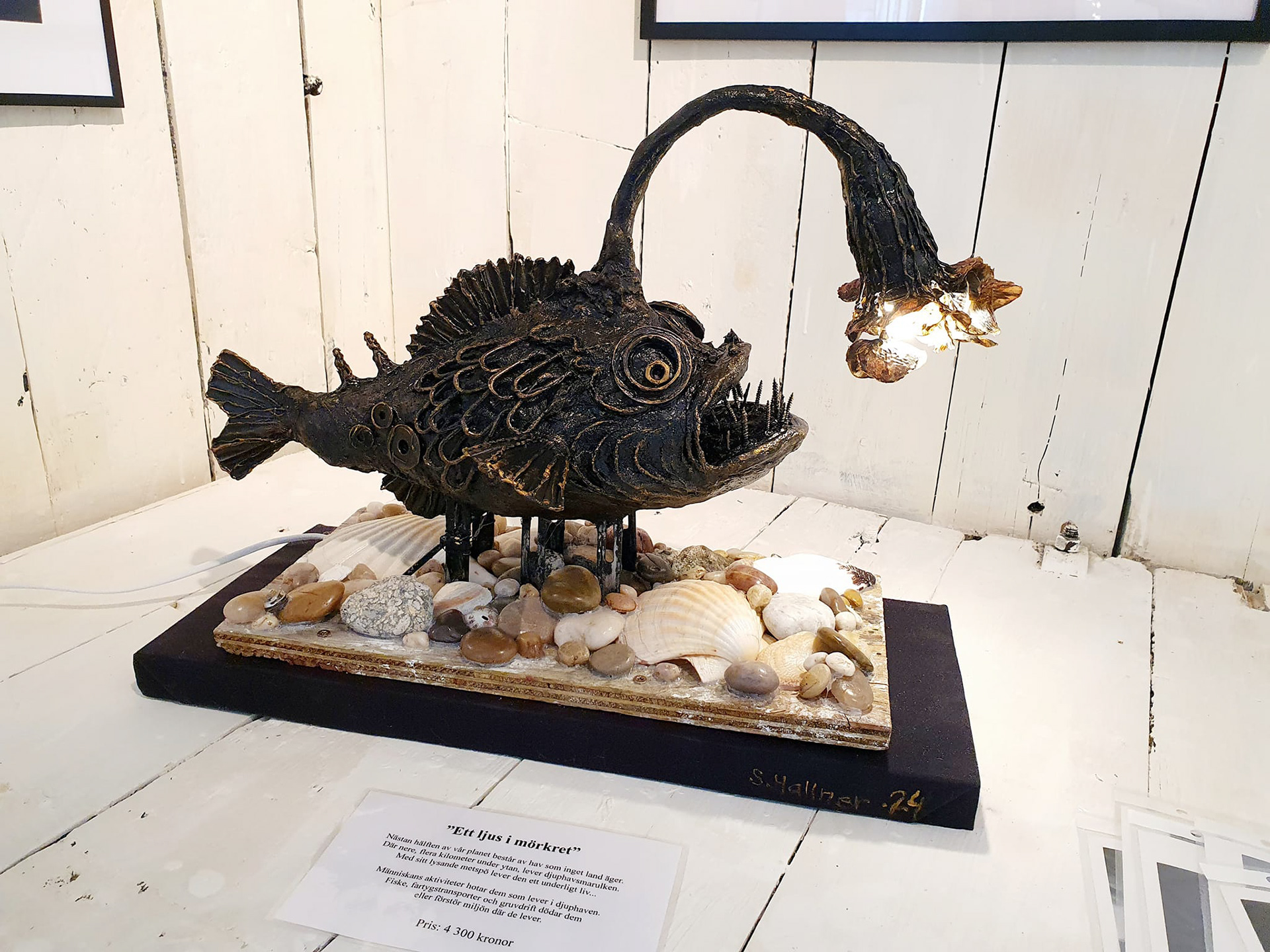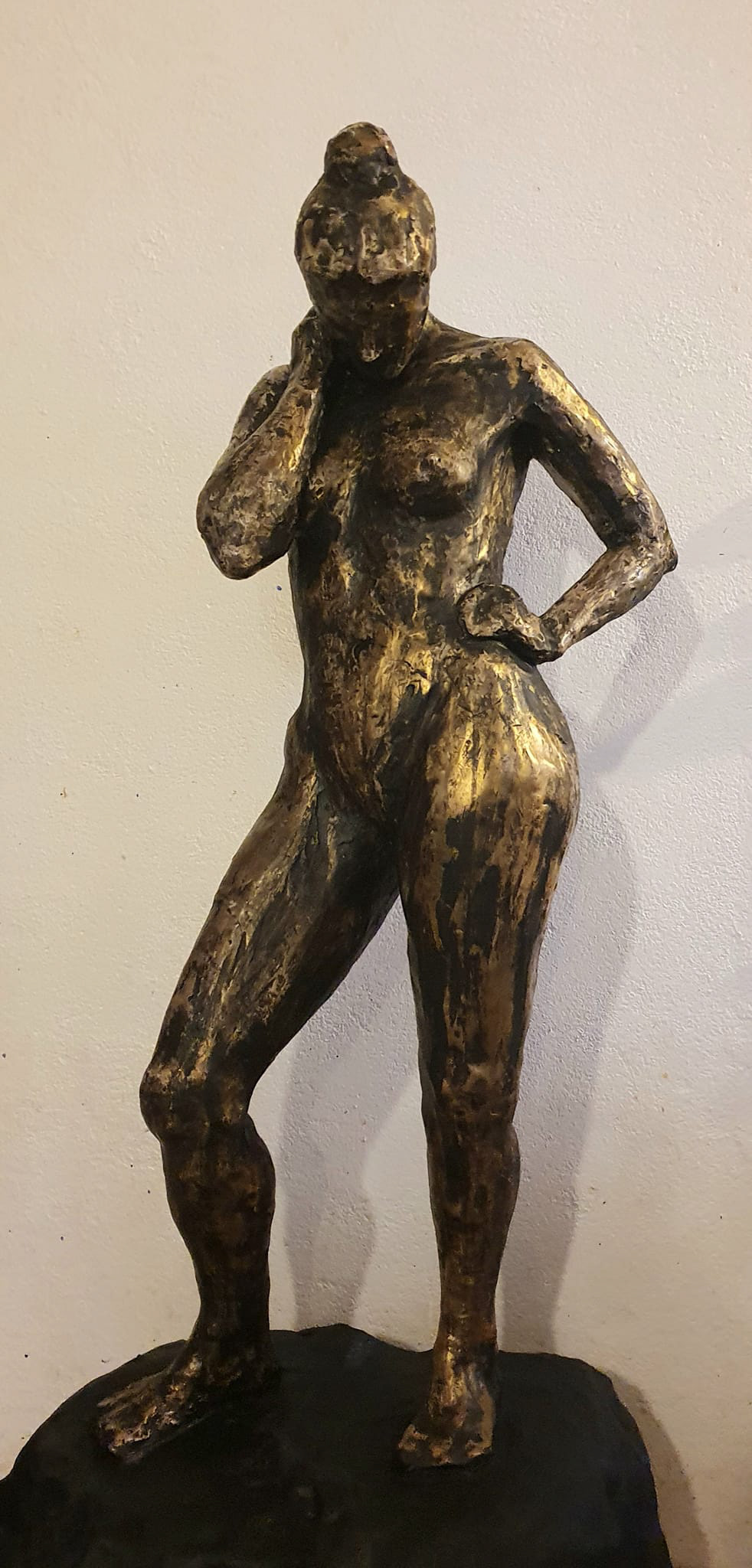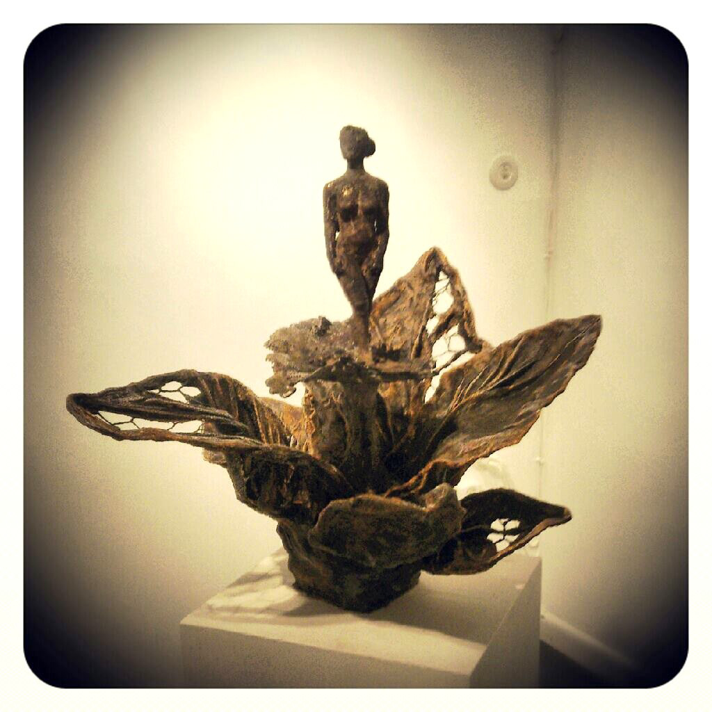 När jag skulpterar föredrar jag att tänka återbruk. Jag använder delvis material som jag hittar i lådorna hemma och sådant som skulle kastas bort. Varför inte förvandla skräp till konst? Kvinnan i blomman är dock gjuten i brons och den stående damen är gjuten i gips.